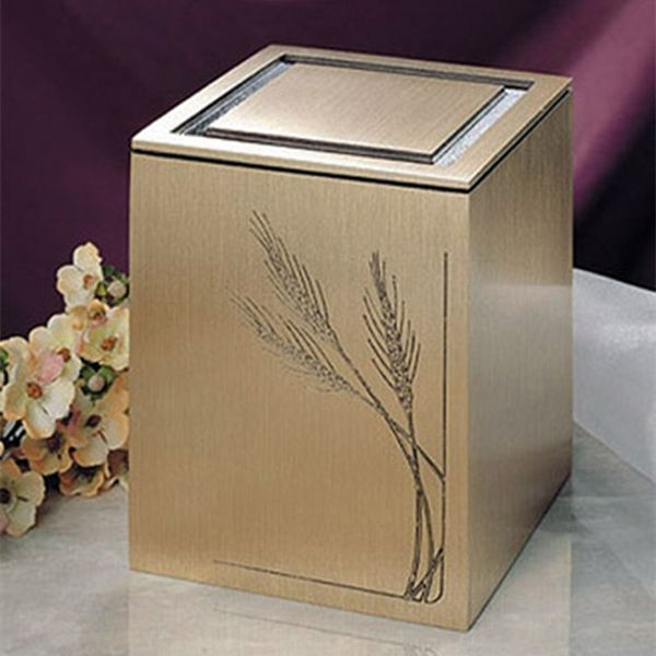 The Guardian Wheat cremation urn is a rectangular wrought bronze cube. It features a wheat engraving.