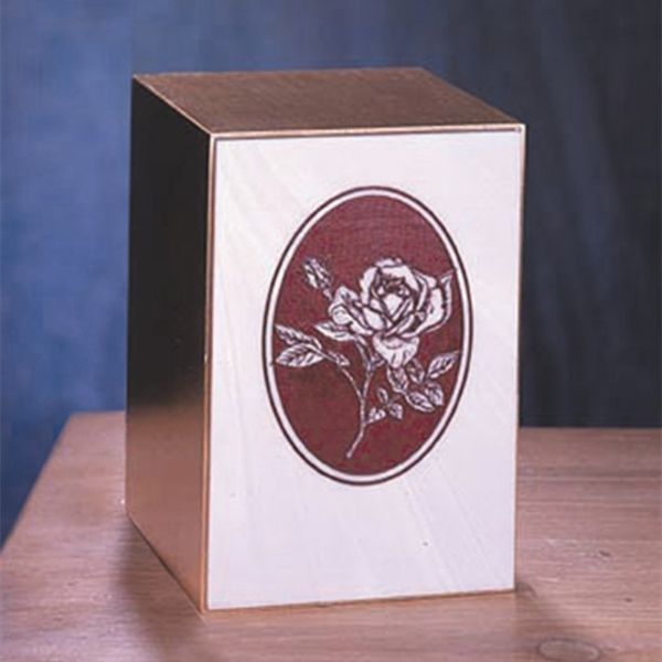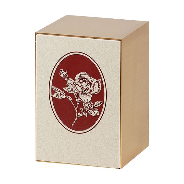 The Eternal Rose cremation urn is a solid bronze urn crafted in the shape of a rectangular cube with a rose composite engraving.