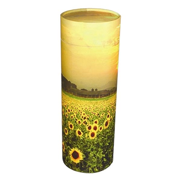The Sunflower Fields scattering cremation urn is made from environmentally-friendly materials and contains no metal or plastic. It has a top-opening tube and is intended to enhance a cremation scattering ceremony. Once the ashes have been scattered, the scattering tube can be retained to hold a small portion of unscattered ashes or small mementos from the service.