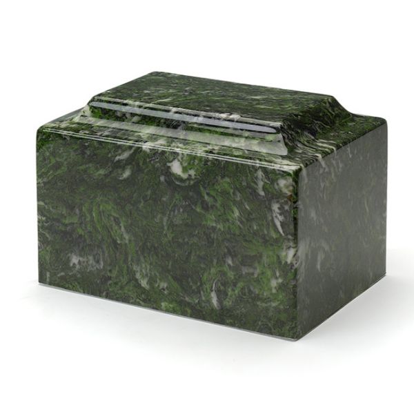The Classic Verde cultured marble cremation urn is crafted in the shape of a rectangular cube. The urn cavity is accessible from a bottom-opening stopper. Since each urn is unique, please allow for slight variations in the pattern, texture and intensity of the cultured marble.