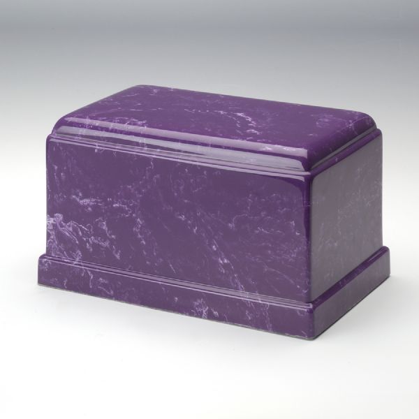 The Olympus Amethyst cultured marble cremation urn is crafted in the shape of a rectangular cube. The urn cavity is accessible from a bottom-opening stopper. Since each urn is unique, please allow for slight variations in the pattern, texture and intensity of the cultured marble.