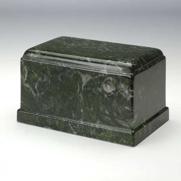 The Olympus Verde cultured marble cremation urn is crafted in the shape of a rectangular cube. The urn cavity is accessible from a bottom-opening stopper. Since each urn is unique, please allow for slight variations in the pattern, texture and intensity of the cultured marble.