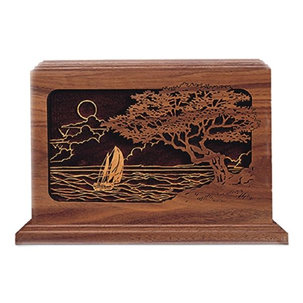 The Seascape is an walnut hardwood cremation urn crafted in the shape of a rectangular cube with a laser-etched front panel.