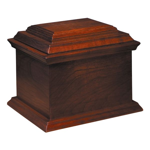 The Hilton hardwood cremation urn is crafted from solid cherry wood in the shape of a rectangular cube with a stylized top and base.