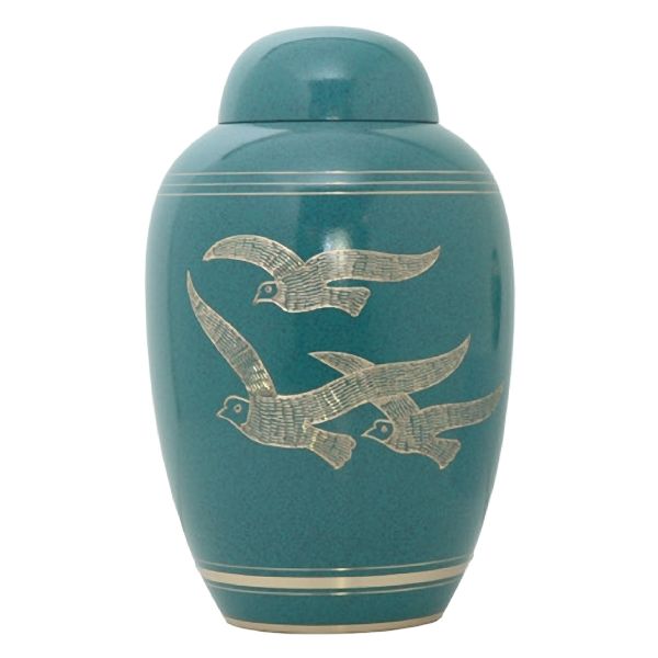 The Teal Birds brass cremation urn is crafted in the shape of a classic vase with an enamel finish and a "Going Home" birds engraving. It has a threaded, top-opening lid.