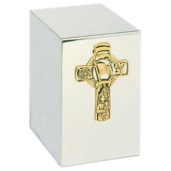 The Firefighter stainless steel cremation urn is crafted in the shape of a rectangular cube with a polished mirror finish and a bronze firefighter cross appliqué. It has a rear-opening panel that attaches with screws.