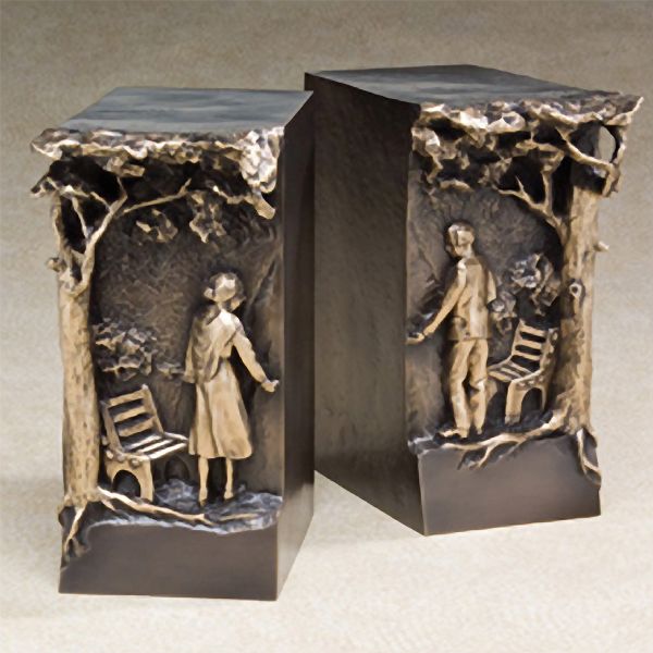 The Fidelis bronze companion cremation urn is crafted in the shape of a two separate rectangular cubes, with a front panel featuring a man and a woman together in the park. The two separate urns are intended to be positioned together.