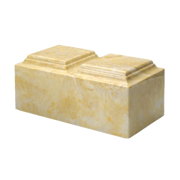 The Companion Gold cultured marble companion cremation urn is crafted in the shape of a rectangular cube. It has a double compartment that opens with a bottom-opening stopper. Since each urn is unique, please allow for slight variations in the pattern, texture and intensity of the cultured marble.