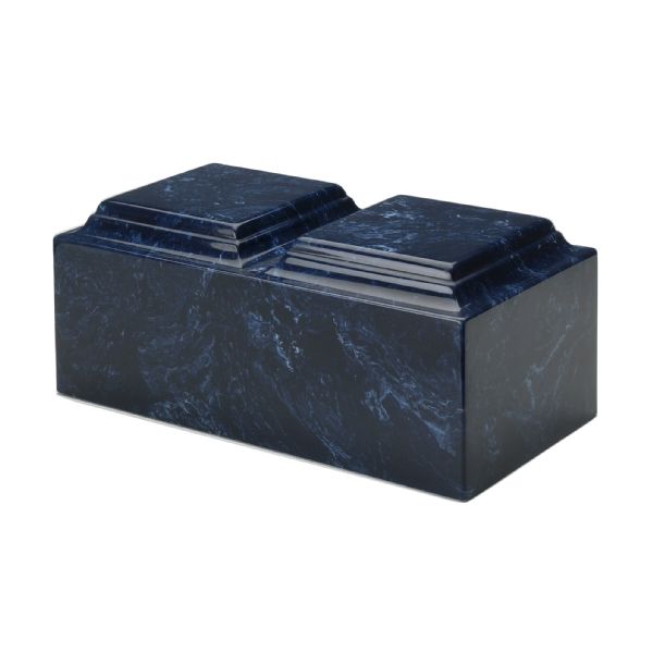 The Companion Navy cultured marble companion cremation urn is crafted in the shape of a rectangular cube. It has a double compartment that opens with a bottom-opening stopper. Since each urn is unique, please allow for slight variations in the pattern, texture and intensity of the cultured marble.