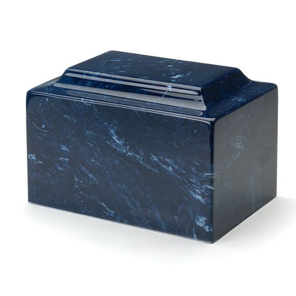 The Classic Navy Keepsake cremation urn is crafted from cultured marble in the shape of a rectangular cube. The urn cavity is accessible from a bottom-opening stopper. Since each urn is unique, please allow for slight variations in the pattern, texture and intensity of the cultured marble.