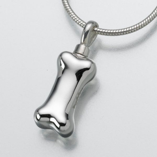 The Dog Bone cremation jewelry pendant is a sterling silver charm and includes a 20" sterling silver snake chain. Cremation jewelry ash pendant necklaces are designed to hold a small portion of ashes, or cremated remains, a small lock of hair, dried flowers, or earth from a special location. The Dog Bone pendant makes it possible for family members or friends to keep precious and cherished memories close to the heart.