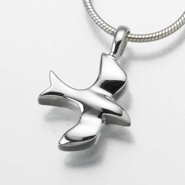 The Dove cremation jewelry pendant is a sterling silver charm and includes a 20" sterling silver snake chain. Cremation jewelry ash pendant necklaces are designed to hold a small portion of ashes, or cremated remains, a small lock of hair, dried flowers, or earth from a special location. The Dove keepsake pendant makes it possible for family members or friends to keep precious and cherished memories close to the heart.