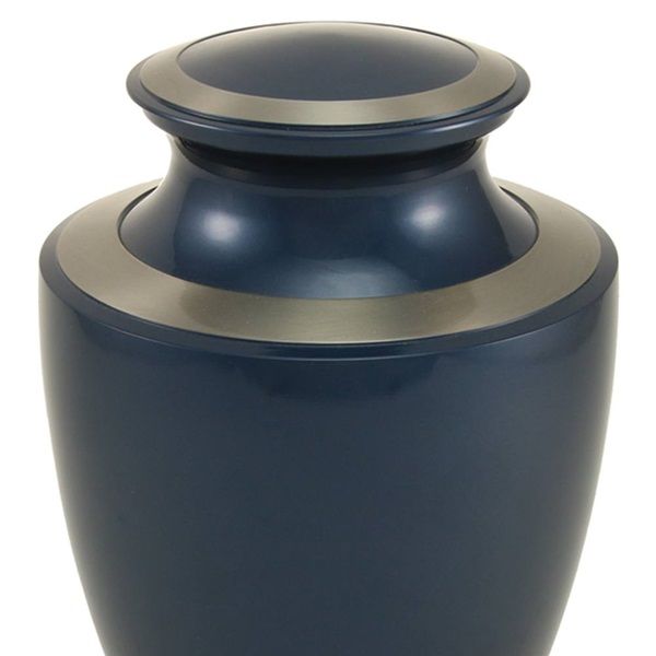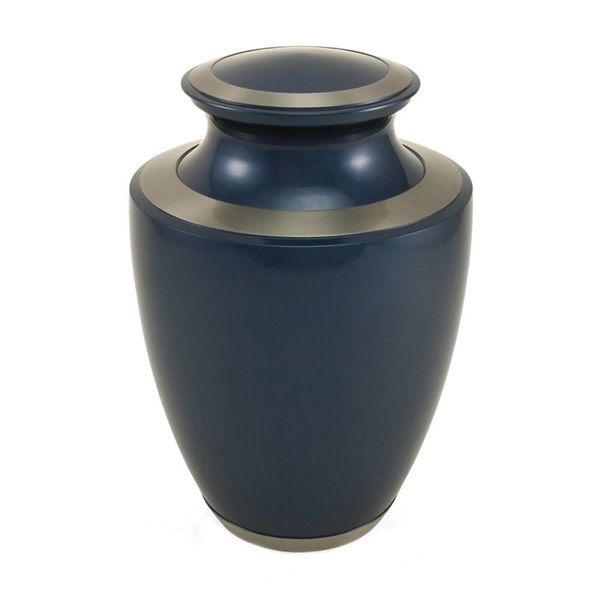 The Trinity Moonlight Blue brass cremation urn is crafted in the shape of a classic vase with a threaded, top-opening lid and a hand-painted finish.