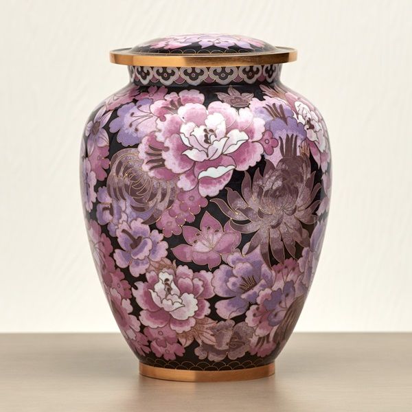 The Floral Blush Elite cloisonné cremation urn is crafted in the shape of a traditional style vase with a threaded, top-opening lid.