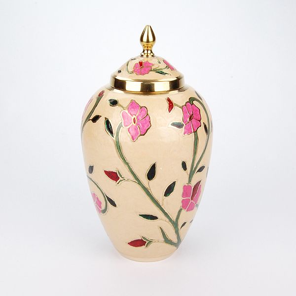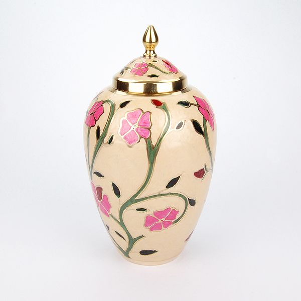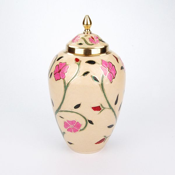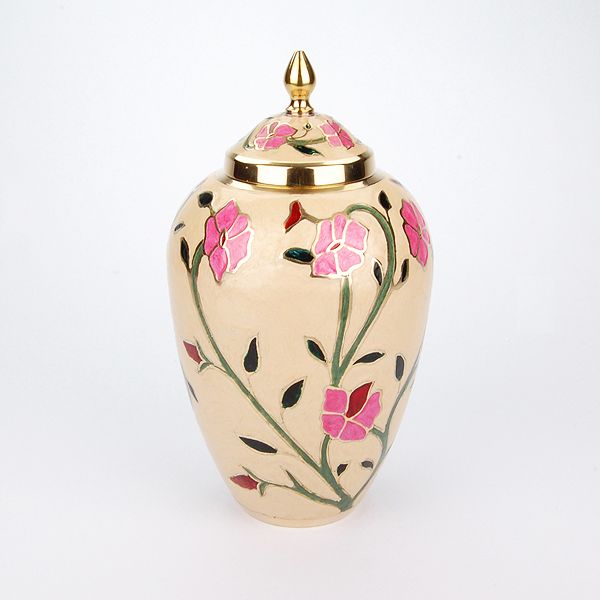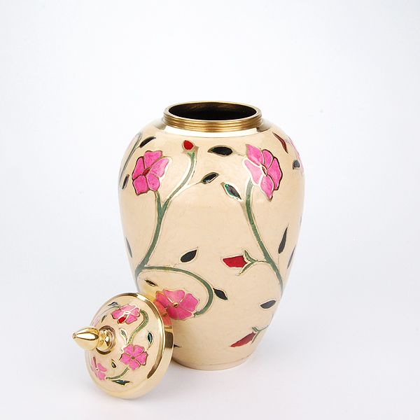 The Heather brass cremation urn is crafted in the shape of a classic vase with a floral enamel finish. It has a threaded, top-opening lid.