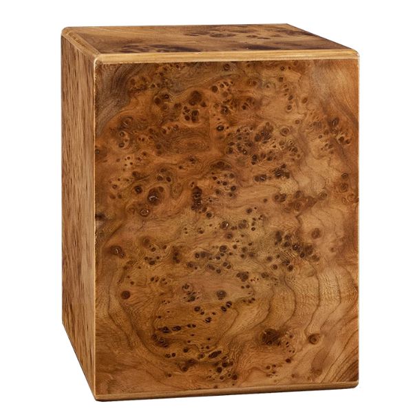 The Elise I hardwood cremation urn is crafted in the shape of a rectangular cube an elm burl Piano Wood finish.