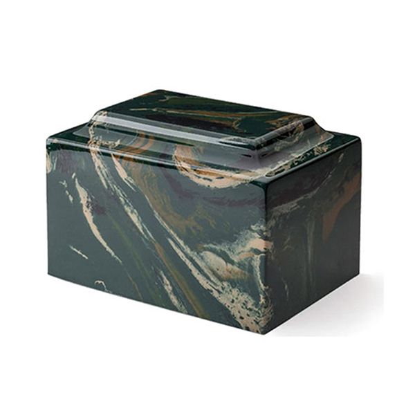 The Camouflage cultured marble cremation urn is crafted in the shape of a rectangular cube with a military-like camouflage finish. It has a bottom-opening stopper. Since each urn is unique, please allow for slight variations in the pattern, texture and intensity of the cultured marble.
