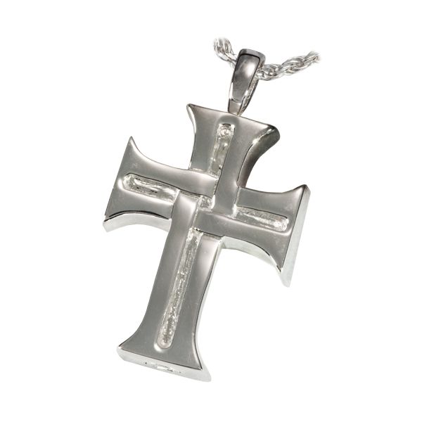 The Men's Cross cremation jewelry necklace is a platinum charm and includes a 20" sterling silver metal rope chain. The pendant is designed to hold a small portion of ashes, or cremains, a small lock of hair, dried flowers, or earth from a special location. The Men's Cross pendant makes it possible for family members or friends to keep precious and cherished memories close to the heart.