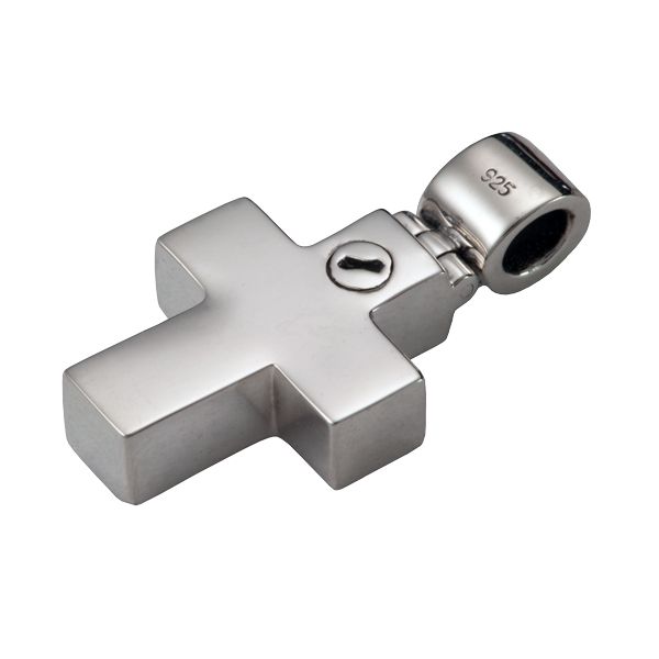The Paw Print Cross cremation jewelry necklace is a sterling silver charm and includes a 20" sterling silver metal rope chain. The pendant is designed to hold a small portion of ashes, or cremains, a small lock of hair, dried flowers, or earth from a special location. The Paw Print Cross pendant makes it possible for family members or friends to keep precious and cherished memories close to the heart.