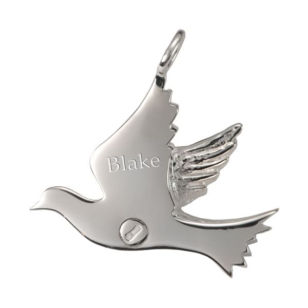 The Dove cremation jewelry necklace is a platinum charm and includes a 20" sterling silver metal rope chain. The pendant is designed to hold a small portion of ashes, or cremains, a small lock of hair, dried flowers, or earth from a special location. The Dove pendant makes it possible for family members or friends to keep precious and cherished memories close to the heart.