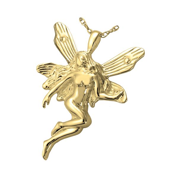 The Fairy cremation jewelry necklace is a 14K yellow gold charm and includes a 20" gold-filled metal rope chain. The pendant is designed to hold a small portion of ashes, or cremains, a small lock of hair, dried flowers, or earth from a special location. The Fairy pendant makes it possible for family members or friends to keep precious and cherished memories close to the heart.