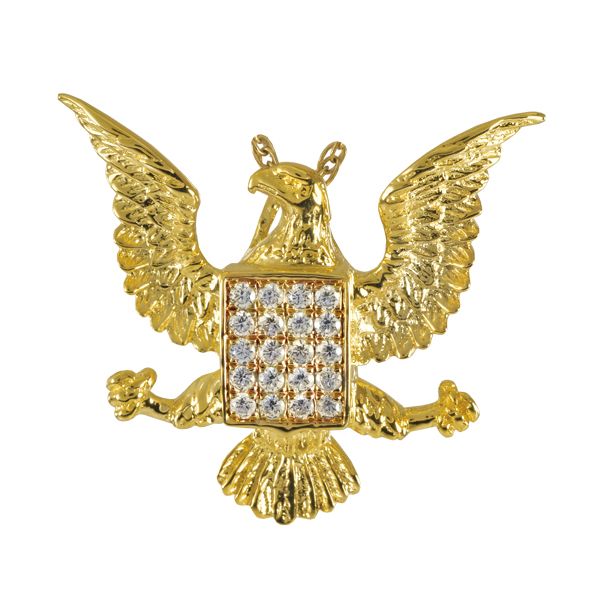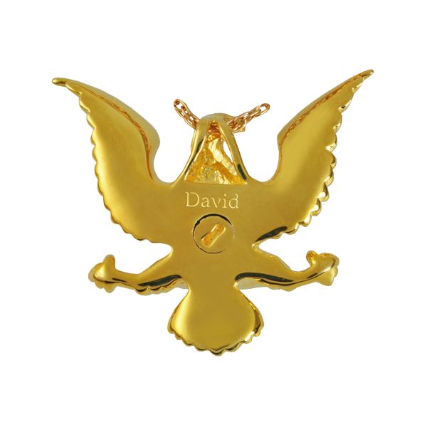 The Eagle and Stones Badge cremation jewelry necklace is a 14K yellow gold charm and includes a 20" gold-filled metal rope chain. The pendant is designed to hold a small portion of ashes, or cremains, a small lock of hair, dried flowers, or earth from a special location. The Eagle and Stones Badge pendant makes it possible for family members or friends to keep precious and cherished memories close to the heart.
