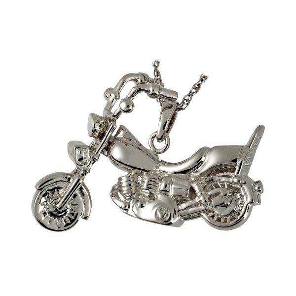 The Motorcycle cremation jewelry necklace is a sterling silver charm and includes a 20" sterling silver metal rope chain. The pendant is designed to hold a small portion of ashes, or cremains, a small lock of hair, dried flowers, or earth from a special location. The Motorcycle pendant makes it possible for family members or friends to keep precious and cherished memories close to the heart.
