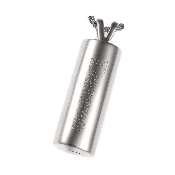 The Elegant Cylinder cremation jewelry pendant is a sterling silver charm with a sterling silver rope chain. The pendant is designed to hold a small portion of ashes, or cremains, a small lock of hair, dried flowers, or earth from a special location. The Elegant Cylinder pendant makes it possible for family members or friends to keep precious and cherished memories close to the heart.