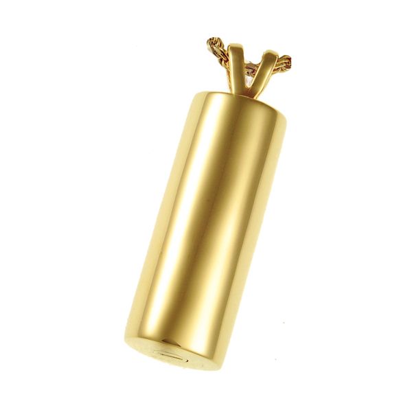 The Elegant Cylinder cremation jewelry pendant is a gold vermeil charm with a gold-filled rope chain. The pendant is designed to hold a small portion of ashes, or cremains, a small lock of hair, dried flowers, or earth from a special location. The Elegant Cylinder pendant makes it possible for family members or friends to keep precious and cherished memories close to the heart.