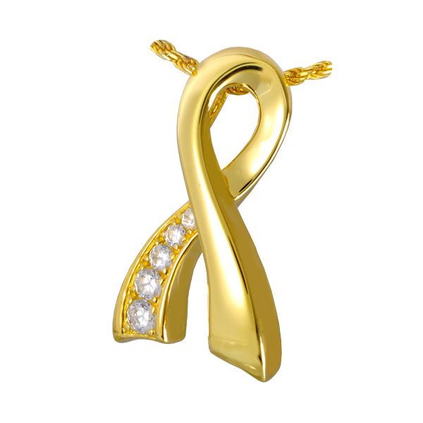 The Memorial Ribbon cremation jewelry pendant is a gold vermeil charm with a gold-filled rope chain. The pendant is designed to hold a small portion of ashes, or cremains, a small lock of hair, dried flowers, or earth from a special location. The Memorial Ribbon pendant makes it possible for family members or friends to keep precious and cherished memories close to the heart.