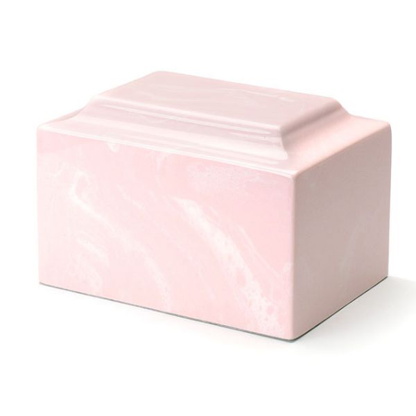 The Classic Pink cultured marble cremation urn is crafted in the shape of a rectangular cube. The urn cavity is accessible from a bottom-opening stopper. Since each urn is unique, please allow for slight variations in the pattern, texture and intensity of the cultured marble.