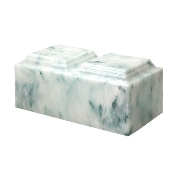 The Companion Teal Onyx cultured marble companion cremation urn is crafted in the shape of a rectangular cube. It has a double compartment that opens with a bottom-opening stopper. Since each urn is unique, please allow for slight variations in the pattern, texture and intensity of the cultured marble.