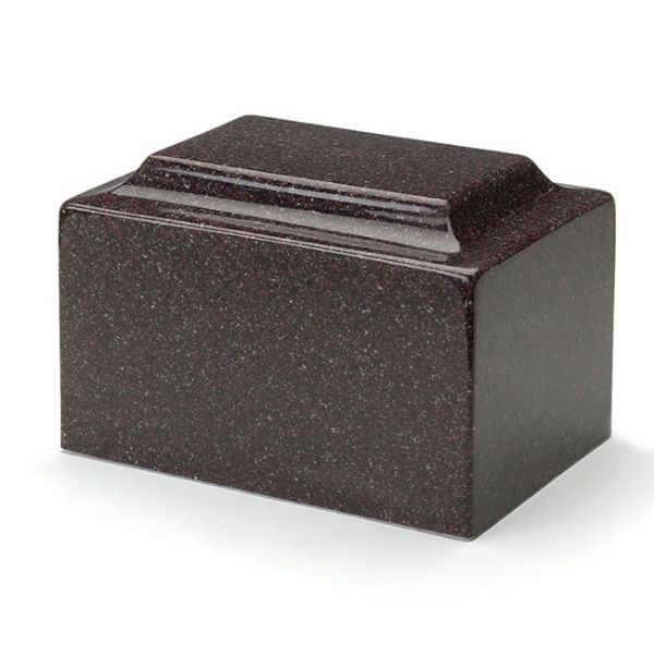 The Classic Vintage Red Granitex Keepsake cremation urn is crafted from cultured marble in the shape of a rectangular cube. The urn cavity is accessible from a bottom-opening stopper. Since each urn is unique, please allow for slight variations in the pattern, texture and intensity of the cultured marble.
