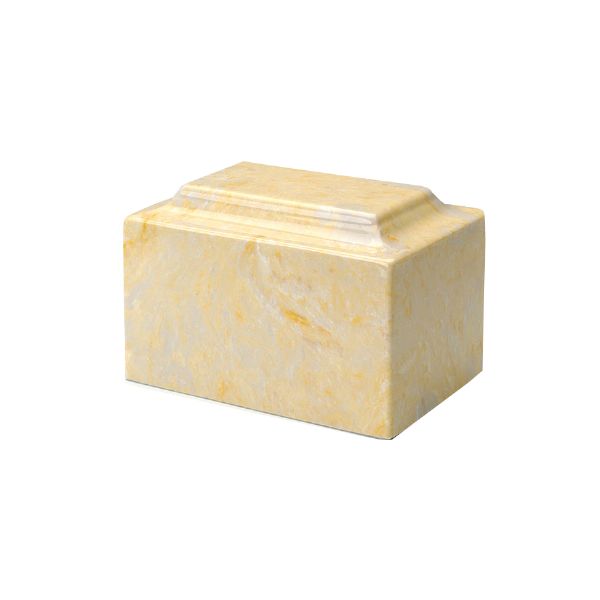 The Classic Gold token cremation urn is crafted from cultured marble in the shape of a rectangular cube. The urn cavity is accessible from a bottom-opening stopper. Since each urn is unique, please allow for slight variations in the pattern, texture and intensity of the cultured marble.