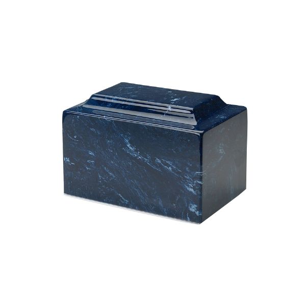 The Classic Navy token cremation urn is crafted from cultured marble in the shape of a rectangular cube. The urn cavity is accessible from a bottom-opening stopper. Since each urn is unique, please allow for slight variations in the pattern, texture and intensity of the cultured marble.