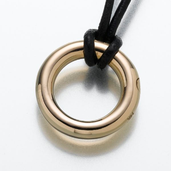 The Eternity cremation jewelry pendant is a 14K yellow gold charm and includes a black satin cord. Cremation jewelry ash pendant necklaces are designed to hold a small portion of ashes, or cremated remains, a small lock of hair, dried flowers, or earth from a special location. The Eternity keepsake pendant makes it possible for family members or friends to keep precious and cherished memories close to the heart.