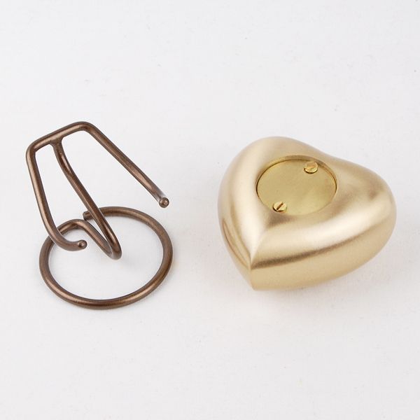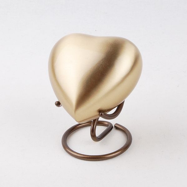 The Grecian Rustic Bronze brass token cremation urn is crafted in the shape of a heart and includes a metal display stand.