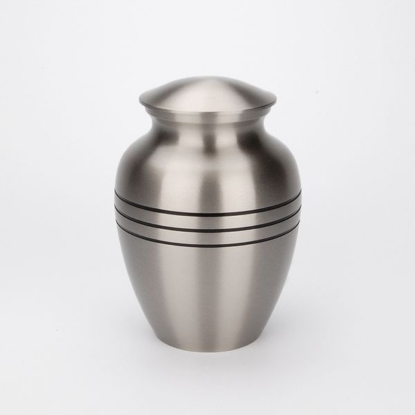 The Classic Pewter with Three Stripes keepsake brass cremation urn is crafted in the shape of a classic style vase with a top-opening lid.