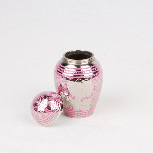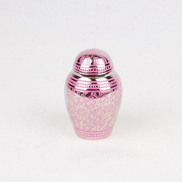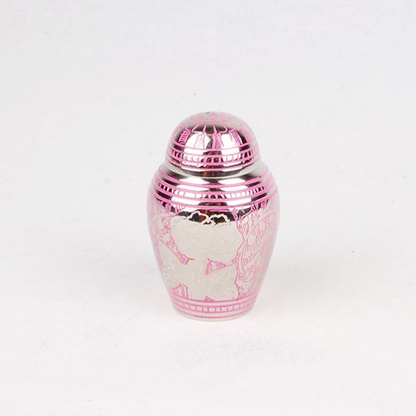 The Rose Pink brass token cremation urn is crafted in the shape of a classic style vase with a frosted rose design engraving and a polished, mirror finish. It has a threaded, top-opening lid.