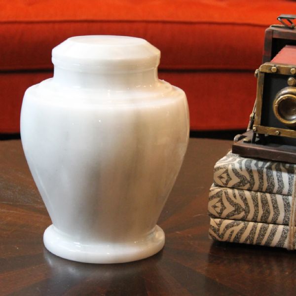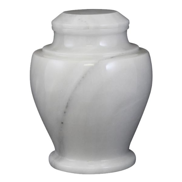 The Carpel Antique White genuine stone cremation urn is crafted from natural-quarried marble in the shape of a classic style vase. It has a top-opening lid that can be sealed closed using the included epoxy sealant.