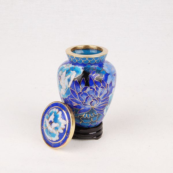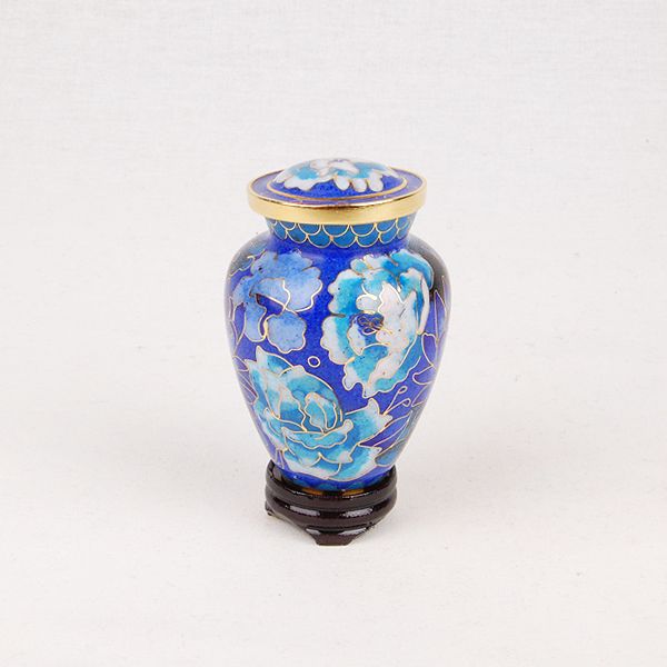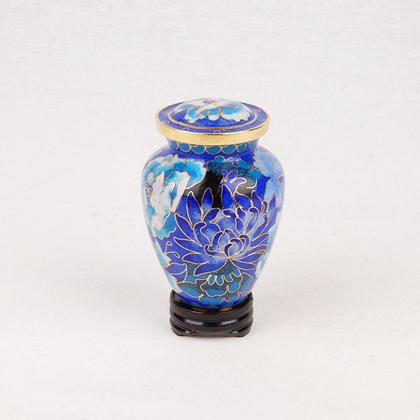 The Floral Blue Elite Cloisonné token cremation urn is crafted in the shape of a classic style vase with a threaded, top-opening lid.