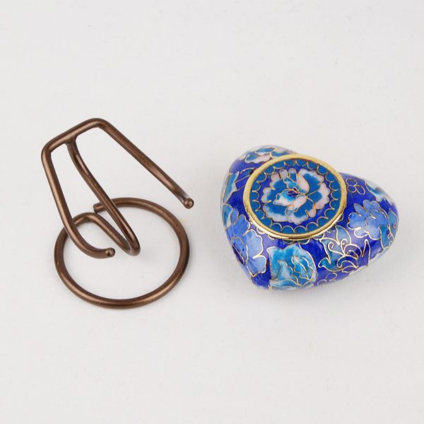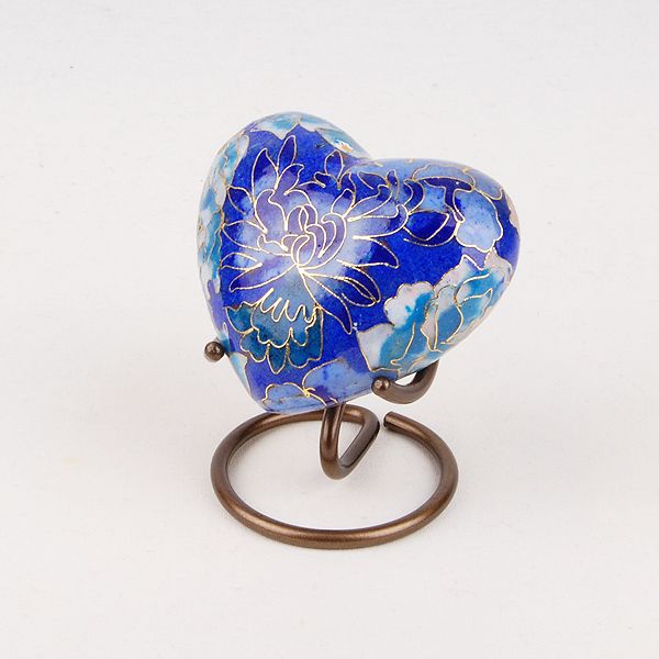 The Floral Blue Elite Cloisonné token cremation urn is crafted in the shape of a heart and includes a metal display stand.