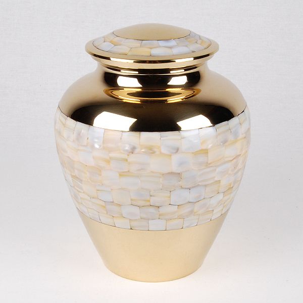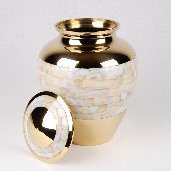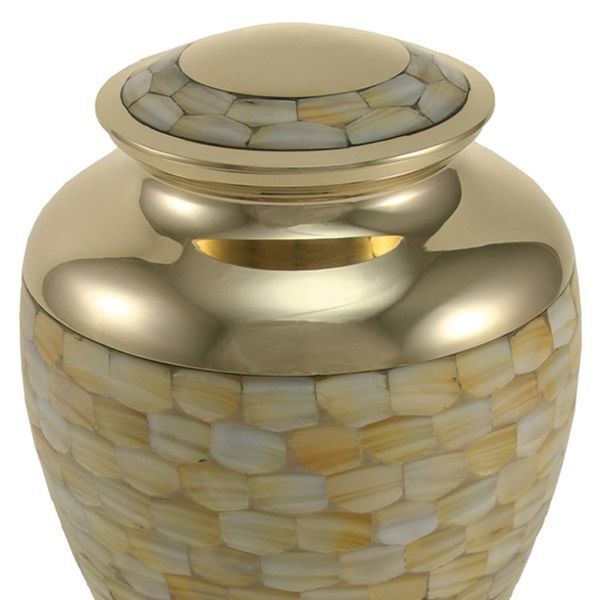 The Mother of Pearl Elite brass cremation urn is crafted in the shape of a classic vase with a threaded, top-opening lid.
