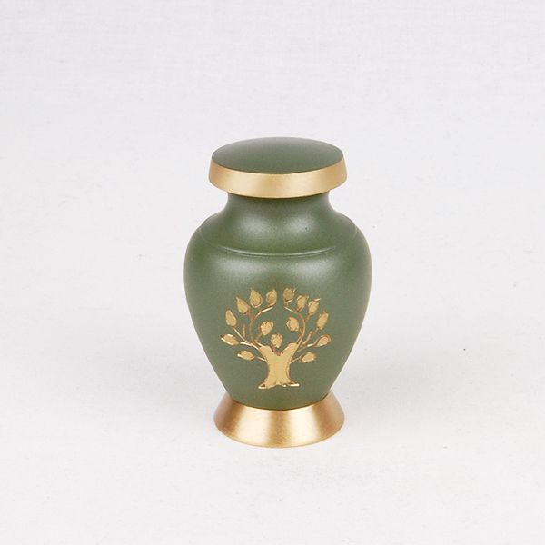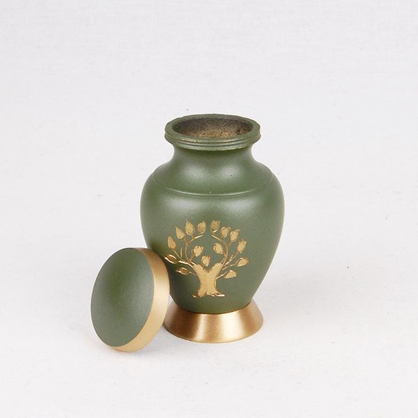 The Aria Tree of Life brass token cremation urn is crafted in the shape of a classic style vase with a threaded, top-opening lid.
