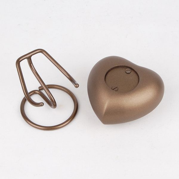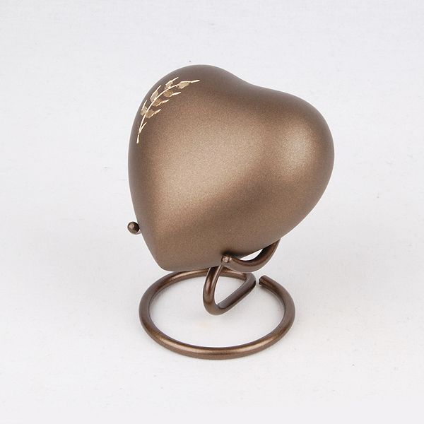 The Aria Wheat brass token cremation urn is crafted in the shape of a heart and includes a metal display stand.
