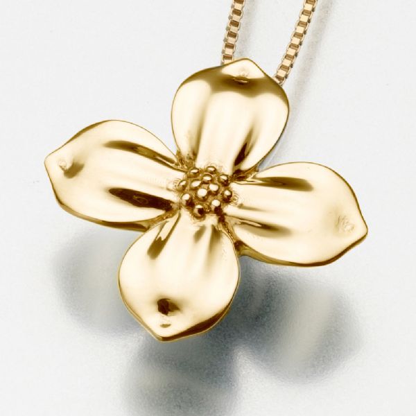 The Dogwood Blossom cremation jewelry pendant is a 14K yellow gold charm and includes a 24" gold-filled box chain. Cremation jewelry ash pendant necklaces are designed to hold a small portion of ashes, or cremated remains, a small lock of hair, dried flowers, or earth from a special location. The Dogwood Blossom keepsake pendant makes it possible for family members or friends to keep precious and cherished memories close to the heart.