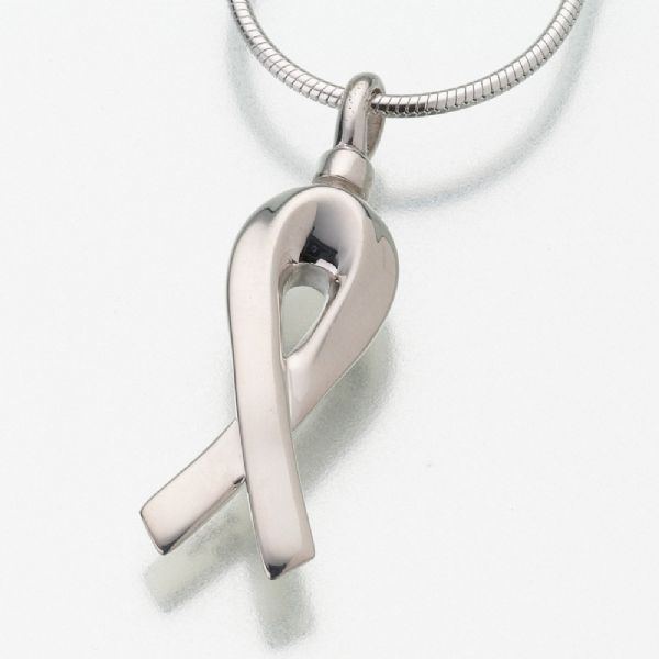 The Remembrance Ribbon cremation jewelry pendant is a sterling silver charm and includes a 20" sterling silver snake chain. Cremation jewelry ash pendant necklaces are designed to hold a small portion of ashes, or cremated remains, a small lock of hair, dried flowers, or earth from a special location. The Remembrance Ribbon keepsake pendant makes it possible for family members or friends to keep precious and cherished memories close to the heart.