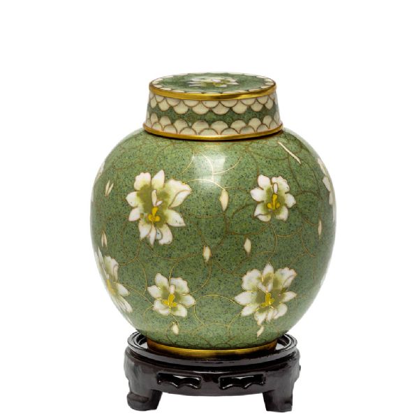 The Pear Blossom cloisonné keepsake cremation urn is crafted in the shape of a traditional style vase with a hand-applied enamel. It has a top-opening lid and a plastic base is included.
