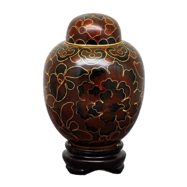 The Amber cloisonné token cremation urn is crafted in the shape of a traditional style vase with a hand-applied enamel. It has a top-opening lid and a plastic base is included.