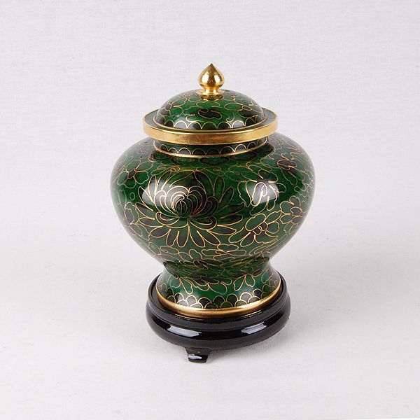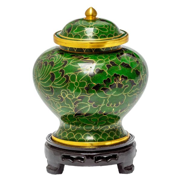 The Mandarin Forest Green cloisonné keepsake cremation urn is crafted in the shape of a traditional style vase with a hand-applied enamel. It has a top-opening lid and a plastic base is included.